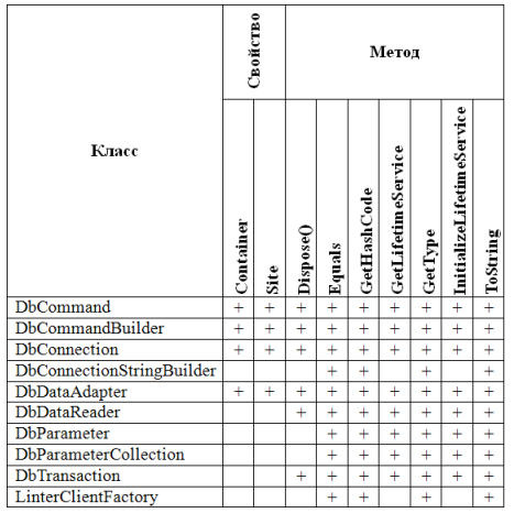 Общие свойства и методы классов ADO.NET-провайдера СУБД ЛИНТЕР представлены в таблице 43.
